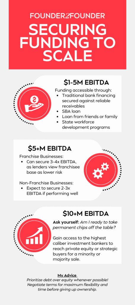 If you’re still passionate about the business and willing to delay personal distributions, you can access significant growth capital without personal guarantees. In franchising specifically, you can typically secure 3-4x EBITDA (roughly $15-20M at $5M EBITDA) because lenders view the diversified franchisee base as lower risk. For non-franchise businesses—whether in consumer goods or multi-site operations—expect a multiple of 2-3x EBITDA if the business is performing well.